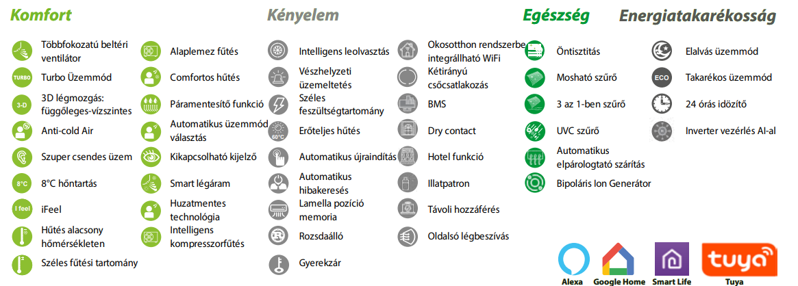Felszerelés és beüzemelés díja bruttó 55.000 Ft, mely tartalmazza a kiszállást, a készülék helyszínre szállítását, a kültéri és beltéri egység felszerelését, elektromos betáp kiépítését aljzatba max. 5 méterig*, a kültéri tartókonzolt, rögzítő elemeket, a vákuumozást, a berendezés beüzemelését és azzal kapcsolatos dokumentumok kitöltését (pl.: beüzemelési jegyzőkönyv, garanciajegy...), valamint a takarítást.